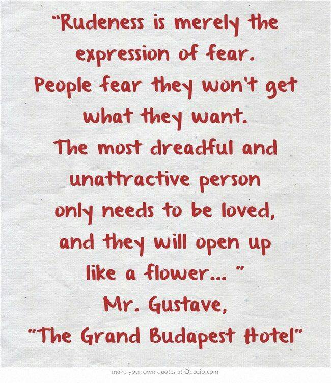 "무례함은 그저 두려움의 한 표현 방법이야. 사람들은 그들이 원하는 걸 갖지 못하게 될 때 두려움을 느끼지. 가장 끔찍하고, 가장 매력 없는 사람들이 오직 사랑을 받고 싶어만 하고 그들은 마치 한 송이 꽃처럼 활짝 펼쳐지지..."